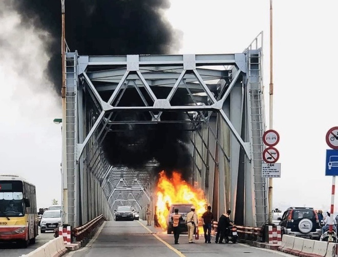 Chiếc Range Rover bốc cháy dữ dội ở làn ôtô trên cầu Chương Dương, Hà Nội. CSGT đã chặn đường 2 đầu cầu, ở làn giữa, để khống chế ngọn lửa.