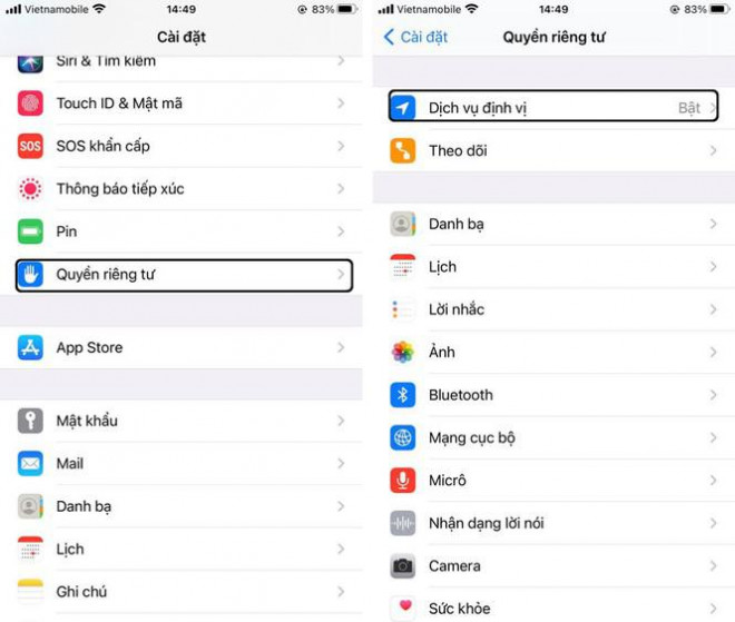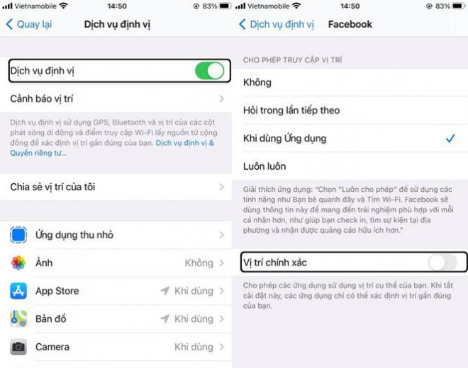 Sau khi cài đặt, một số ứng dụng thường yêu cầu vị trí chính xác của bạn. Trên iOS 14, người dùng có thể thay đổi quyền truy cập vị trí bằng cách vào cài đặt > Quyền riêng tư > Dịch vụ định vị.