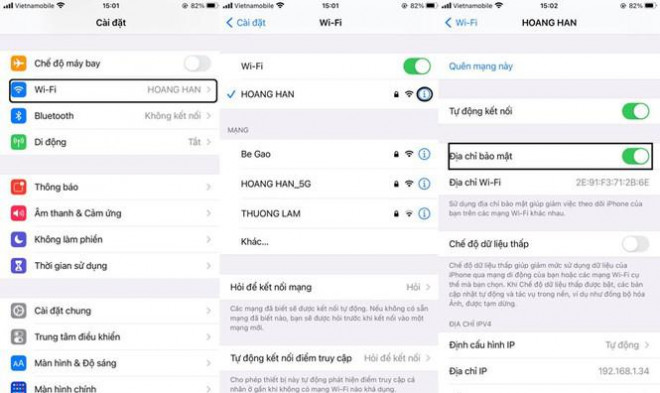 Để thực hiện, bạn vào Cài đặt > Wi-Fi > ấn vào chữ I của mạng Wi-Fi mà bạn đang sử dụng > bật Địa chỉ bảo mật để hạn chế việc iPhone bị theo dõi hoạt động trên internet.