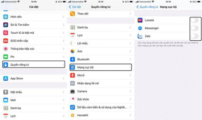 Trên phiên bản iOS 14, tất cả các ứng dụng cần có sự cho phép của người dùng nếu muốn kết nối với các thiết bị thông qua mạng cục bộ (Local Network). Nếu muốn ngăn chặn việc ứng dụng truy cập vào Local Network của mình, bạn vào Cài đặt > Quyền riêng tư > Mạng cục bộ. Tại đây, bạn chỉ cần gạt nút tắt trên các ứng dụng mà mình muốn.