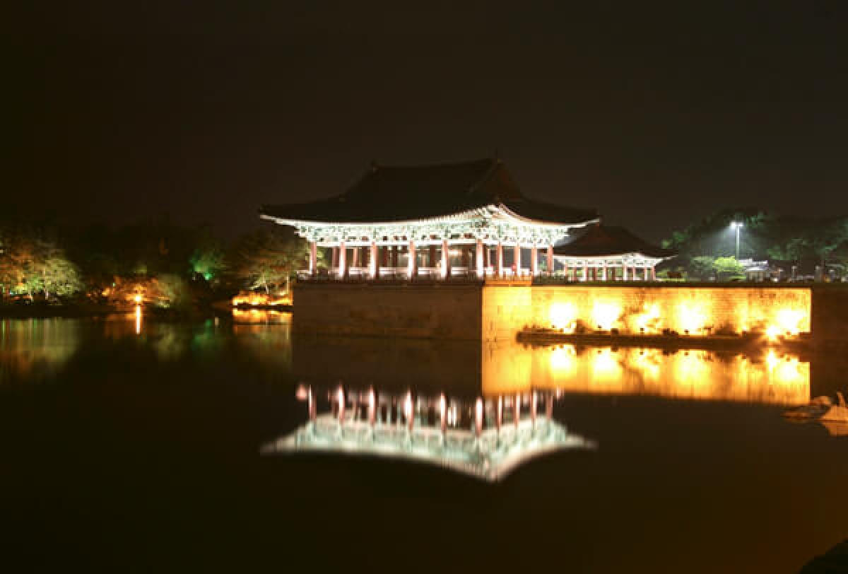 Khung cảnh của nơi đây vào ban đêm còn đẹp hơn cả ban ngày nhờ sự kết hợp hài hòa tuyệt vời giữa thiên nhiên và cung điện cổ kính. Hồ Anapji hay còn có tên là Donggung và Wolji được xây dựng từ thời Silla là điểm ngắm cảnh đêm đẹp nhất ở Gyeonggju. Khi màn đêm buông xuống, đèn xung quanh bật sáng khiến cảnh đêm càng mang không khí cổ xưa, bí ẩn. Thêm vào đó, khu phức hợp Bomun – phiên bản thu nhỏ của đấu trường La Mã cũng là địa điểm hấp dẫn để bạn có thể ngắm cảnh đêm tuyệt đẹp.