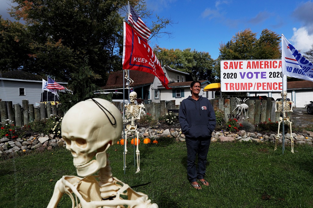 Bà Maranda Joseph đứng trong sân nhà đầy đồ trang trí Halloween và biểu ngữ ủng hộ Tổng thống Donald Trump ở Warren, Ohio. Ảnh: Reuters.