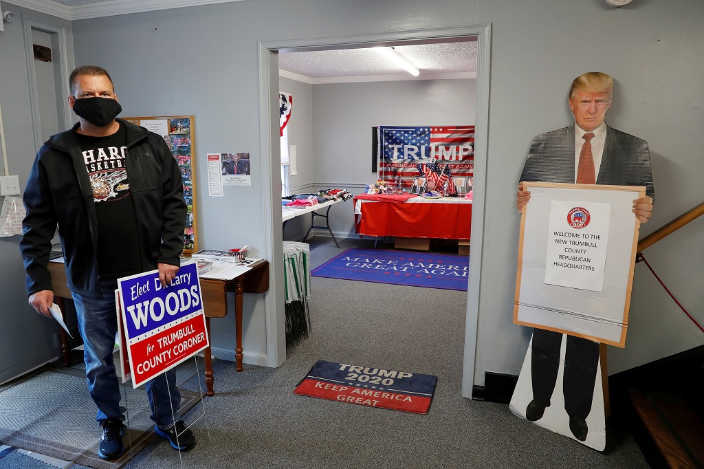Một người ủng hộ ông Trump bên trong trụ sở đảng Cộng hòa tại hạt Trumbull ở Warren, Ohio. Ảnh: Reuters.