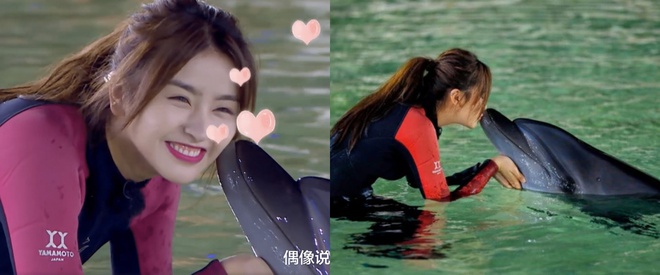 Kim Tử Hàm (trái) và Ngô Tuyên Nghi tham gia show thực tế nhưng bị chỉ trích thiếu hiểu biết khi hôn cá heo.