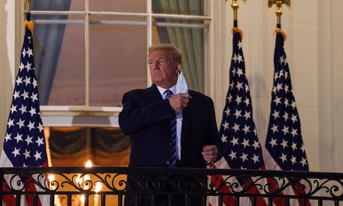 Trump đứng trên ban công Nhà Trắng sau khi xuất viện hôm 5/10. Ảnh: AFP.