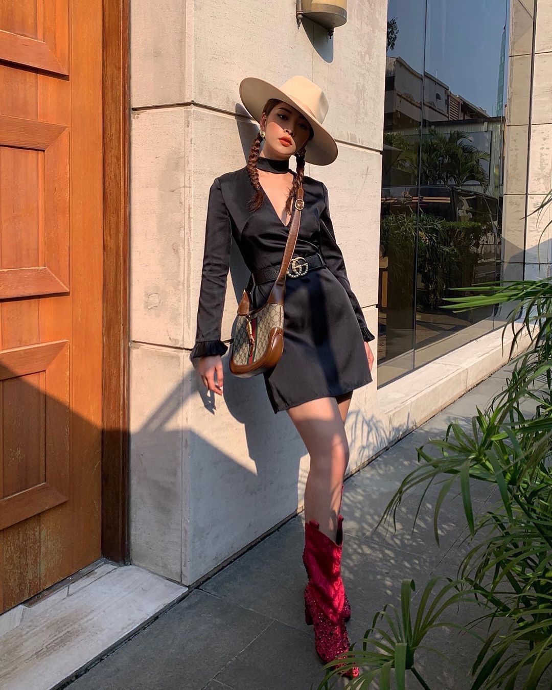 Chi Pu hóa cô nàng cao bồi khi diện trang phục của Gucci. Đặc biệt, người đẹp phá cách bằng việc lựa chọn một đôi boots màu hồng nổi bật hơn hẳn váy cũng như phụ kiện mà không đi theo hướng kết hợp an toàn.