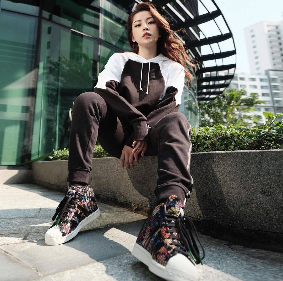 Chi Pu cho thấy hình ảnh năng động với phong cách sporty chic. Cô chọn mặc áo hoodie và quần thể thao màu đen - trắng khá thuần và đi đôi sneaker với họa tiết hoa giúp tổng thể set đồ trở nên ấn tượng hơn.