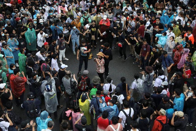 Bất chấp trời mưa, nhiều người biểu tình đã tập trung gần trung tâm thương mại MBK ở thủ đô Bangkok chiều ngày 16/10. Ảnh: Reuters.