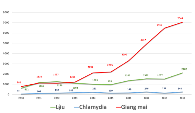 Theo TS.BS Nguyễn Trọng Hào, Giám đốc Bệnh viện Da liễu TP.HCM, từ năm 2010 đến 2019, số bệnh nhân giang mai, lậu và Chlamydia tăng đáng kể tại cơ sở y tế này. Trong năm 2010, số bệnh nhân mắc giang mai được ghi nhận tại đơn vị này là 782 người. Đến năm 2019, con số này tăng lên 7.044 trường hợp.