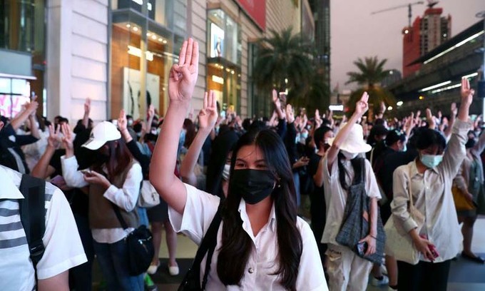 Đám đông giơ ba ngón tay trên nền quốc ca tại các địa điểm công cộng khắp Bangkok, giữa lệnh cấm biểu tình của chính phủ Thái Lan.
