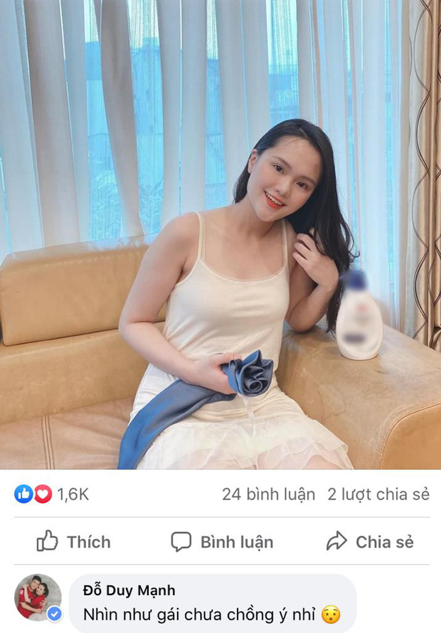 Dưới bức ảnh của vợ, Mạnh "gắt" để lại lời bình: "Nhìn như gái chưa chồng ý nhỉ". Có người đoán rằng Duy Mạnh đang muốn "nịnh" vợ, khen cô nàng vẫn xinh đẹp, trẻ trung như thời thanh tân, chưa cưới chồng. Cũng có người cho rằng anh chàng chỉ là đang "nói mát" vợ về hình ảnh gợi cảm này, lời nhận xét chính là biểu hiện của việc Duy Mạnh đang "ghen" vợ đấy nhé.