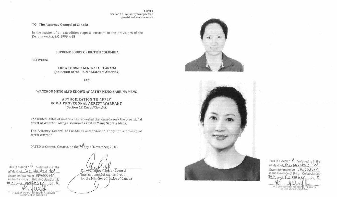Bản sao giấy ủy quyền của Bộ Tư pháp Canada cho Tổng chưởng lư thành phố Vancouver để có lệnh bắt giữ "Công chúa Huawei. Ảnh: BC Supreme Court Exhibit