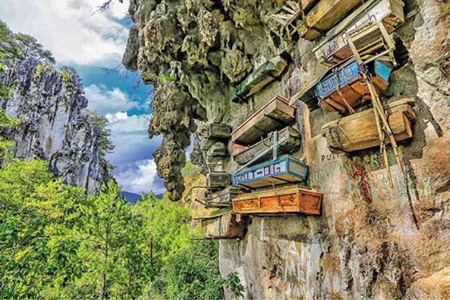 Thay vì chôn xuống đất, từ hàng ngàn năm nay, những cỗ quan tài nơi đây vẫn nằm lơ lửng trên các vách núi. Người bản địa tin rằng, với cách mai táng này, người đã khuất sẽ sớm được lên thiên đàng.