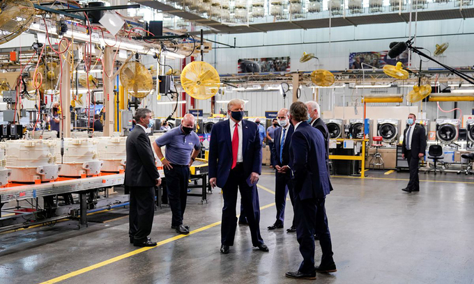 Tổng thống Trump (giữa) thăm nhà máy sản xuất máy giặt Whirlpool Corporation ở Clyde, bang Ohio hồi tháng 8. Ảnh: Reuters.