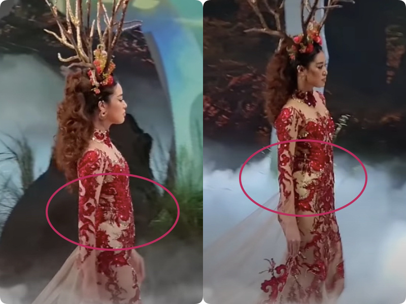 Cụ thể, khi Hoa hậu Khánh Vân mặc đầm đuôi cá và sải bước với thần thái kiêu sa, lạnh lùng. Chẳng hiểu do chiếc váy quá ôm sát cơ thể hay góc máy, Khánh Vân lộ rõ vòng eo bị fan nhận xét ngấn mỡ thừa.