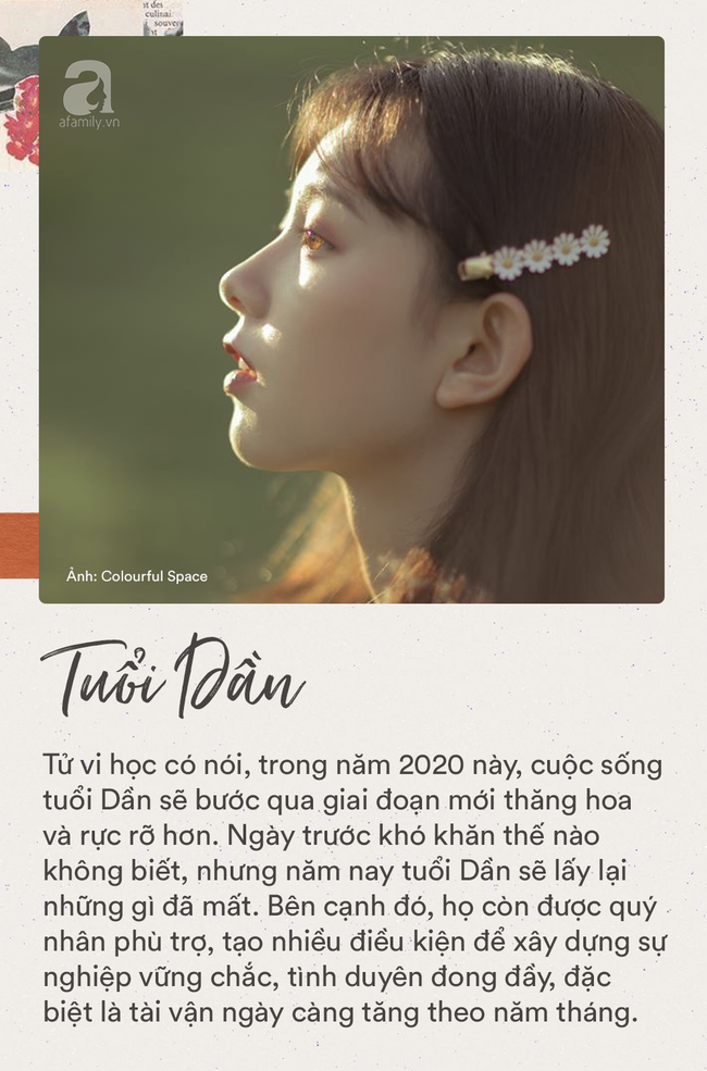 Tử vi học có nói, trong năm 2020 này, cuộc sống tuổi Dần sẽ bước qua giai đoạn mới thăng hoa và rực rỡ hơn. Ngày trước khó khăn thế nào không biết, nhưng năm nay tuổi Dần sẽ lấy lại những gì đã mất. Bên cạnh đó, họ còn được quý nhân phù trợ, tạo nhiều điều kiện để xây dựng sự nghiệp vững chắc, tình duyên đong đầy, đặc biệt là tài vận ngày càng tăng theo năm tháng. Nhìn chung, cuộc sống trong năm 2020 của tuổi Dần có nhiều điều đáng mong chờ.