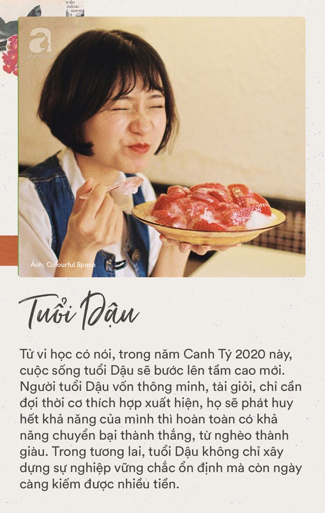 Tử vi học có nói, trong năm Canh Tý 2020 này, cuộc sống tuổi Dậu sẽ bước lên tầm cao mới. Người tuổi Dậu vốn thông minh, tài giỏi, chỉ cần đợi thời cơ thích hợp xuất hiện, họ sẽ phát huy hết khả năng của mình thì hoàn toàn có khả năng chuyển bại thành thắng, từ nghèo thành giàu. Trong tương lai, tuổi Dậu không chỉ xây dựng sự nghiệp vững chắc ổn định mà còn ngày càng kiếm được nhiều tiền. Mọi thành công sẽ đến với họ nhờ vào sự nỗ lực tuyệt vời cùng thời điểm hoàng kim.