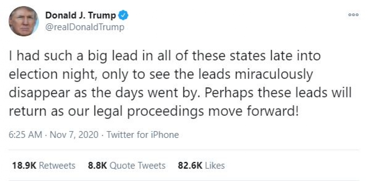 “Tôi đă có lợi thế dẫn đầu ở tất cả các bang này vào đêm bầu cử, lợi thế dẫn trước ấy đă biến mất một cách kỳ lạ trong những ngày sau đó. Có lẽ lợi thế dẫn đầu này sẽ quay trở lại khi quá tŕnh pháp lư của chúng tôi được thúc đẩy!”, ông Trump viết trong ḍng trạng thái mới nhất đăng trên Twitter.