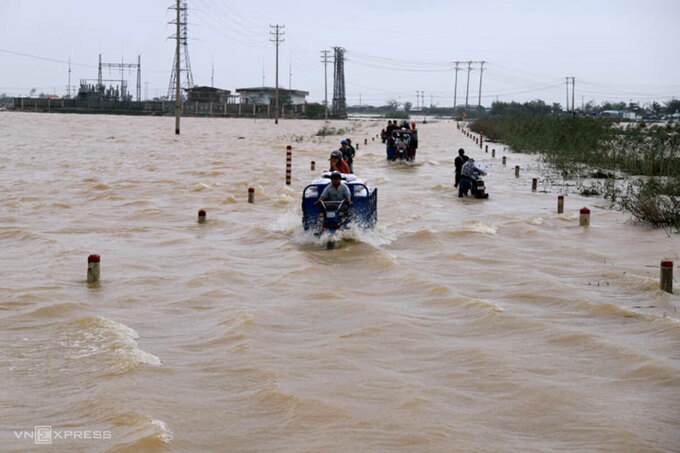 Quốc lộ 49B đi qua xã Phú Thanh, huyện Phú Vang ngập sâu 70-80 cm, các phương tiện không thể qua lại. Người dân phải thuê thuyền, ôtô tải khi cần di chuyển.