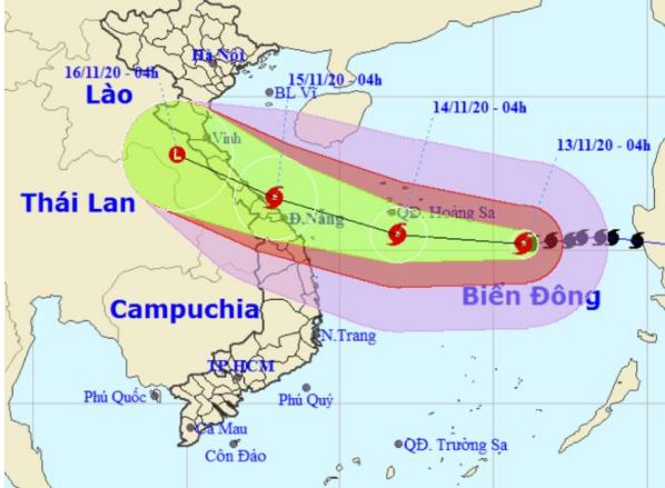 Theo Trung tâm Dự báo KTTV quốc gia, hồi 4h ngày 13/11, tâm bão số 13 (Vamco) cách quần đảo Hoàng Sa khoảng 450km về phía Đông Đông Nam. Sức gió mạnh nhất vùng gần tâm bão mạnh cấp 12 (115-135km/giờ), giật cấp 15. Bán kính gió mạnh từ cấp 6, giật từ cấp 8 trở lên khoảng 250km tính từ tâm bão; bán kính gió mạnh từ cấp 10, giật từ cấp 12 trở lên khoảng 90km tính từ tâm bão.