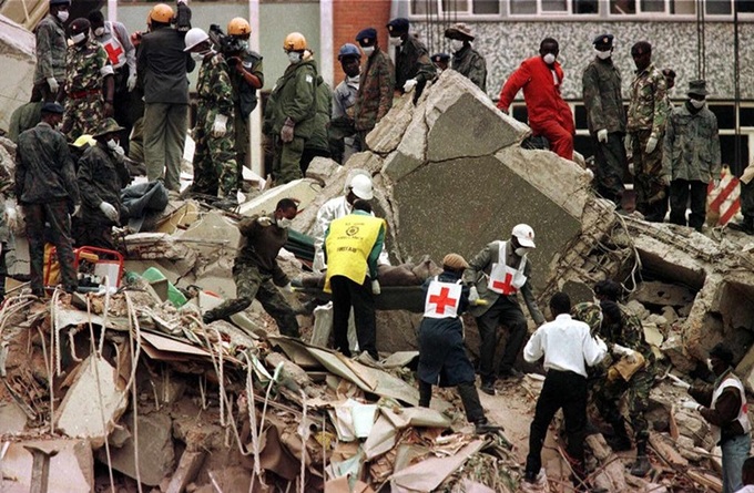 Hiện trường vụ đánh bom đại sứ quán Mỹ ở Nairobi, Kenya năm 1998. Ảnh: AFP.