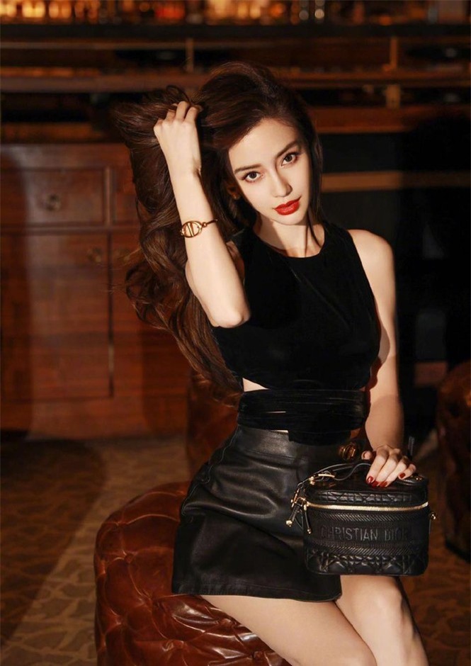 Trang Sina vừa chia sẻ loạt ảnh mới của Angelababy. Trong đó, người đẹp diện "nguyên cây" đen với áo sát nách, quần đùi giả váy và túi xách Dior, cùng vòng tay vàng. Cô trang điểm tỉ mỉ, tập trung vào màu môi đỏ tươi và đôi mắt nâu sắc sảo. Bộ đồ đen giúp cô trông thời thượng, quyến rũ, đồng thời tôn được làn da trắng sứ nõn nà. Mái tóc dài buông xõa càng thêm phần nữ tính.