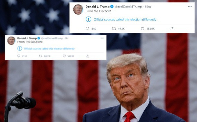 Trước đó, trong đêm 15/11, nhà lãnh đạo Mỹ đã đăng tải nội dung tương tự trên các mạng xã hội này - và ngay lập tức bị dán nhãn cảnh báo là "khác với thông tin từ những nguồn chính thức về cuộc bầu cử".