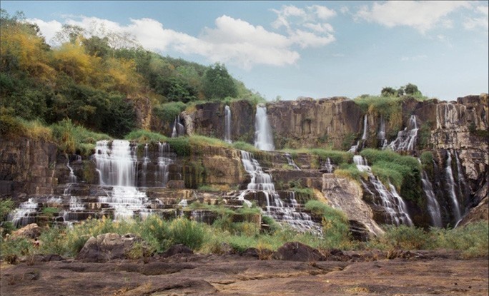 Cũng tại tỉnh Lâm Đồng, du khách không thể bỏ qua thác Pongour, tuyệt tác của tạo hóa, được mệnh danh là "nam thiên đệ nhất thác". Ngọn thác 7 tầng cao tới gần 40 m thuộc huyện Đức Trọng, cách Đà Lạt 50 km. Bao quanh là khu rừng nguyên sinh với thảm thực vật phong phú. Ảnh: Hoang Phuong.