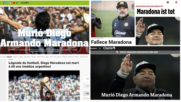 Clarin, trang tin đầu tiên thông báo về cái chết của danh thủ người Argentina, viết dòng tiêu đề ngắn gọn: "Cả thế giới chấn động: Diego Maradona đã qua đời". Tại đây, tờ báo này không giấu được sự tiếc thương và buồn bã: "Ngày không ai mong muốn đã xảy ra. Nó khiến tất cả chúng ta đều bị sốc nặng. Cả thế giới chấn động. Làng bóng đá thế giới sẽ không bao giờ còn như xưa được nữa".