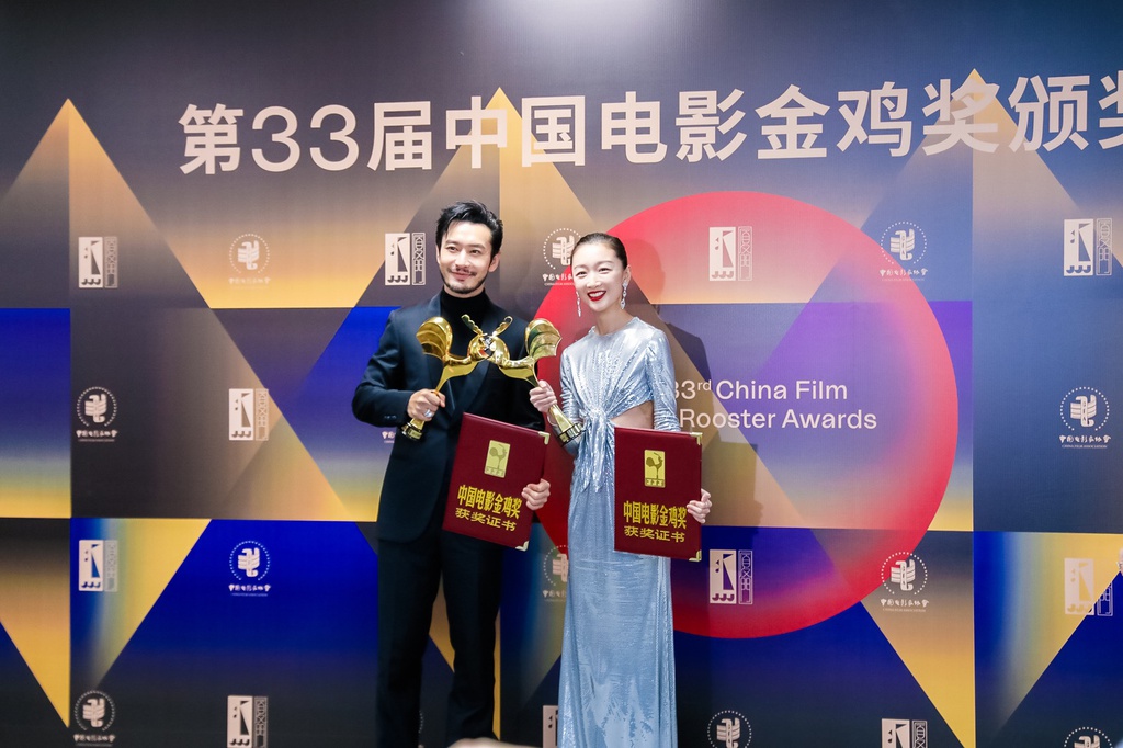 Huỳnh Hiểu Minh và Châu Đông Vũ tại lễ bế mạc và trao giải thưởng Kim Kê lần thứ 33. Ảnh: Sina.