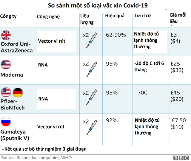 Bảng so sánh một số loại vắc xin trong giai đoạn thử nghiệm. (Nguồn: BBC)