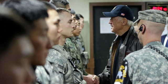 Ông Joe Biden bắt tay binh sĩ Mỹ và Hàn Quốc ở Khu phi quân sự liên Triều vào năm 2013 khi ông còn là phó tổng thống Mỹ. (Ảnh: Getty)