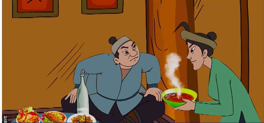 Thấy chồng chê bai đủ thứ, chị vợ vẫn vui vẻ lễ phép với chồng. Được nước, anh chồng như chim sổ lồng quên cả phận mình, nên lên mặt quá. Ngó đi ngó lại không còn gì để chê được nữa, khi thấy vợ bưng thêm nước mắm lên, anh ta nhận lấy rồi nói: