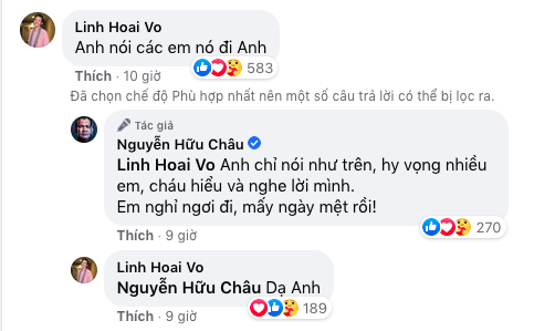Ngay dưới dòng trạng thái của nghệ sĩ Hữu Châu, danh hài Hoài Linh cũng bày tỏ sự đồng tình, ông bình luận: "Anh nói các em nó đi anh". Qua đó có thể thấy, hai nghệ sĩ đều không muốn sự việc bị đẩy đi quá xa, gây ảnh hưởng xấu đến hình ảnh của nghệ sĩ và xã hội.