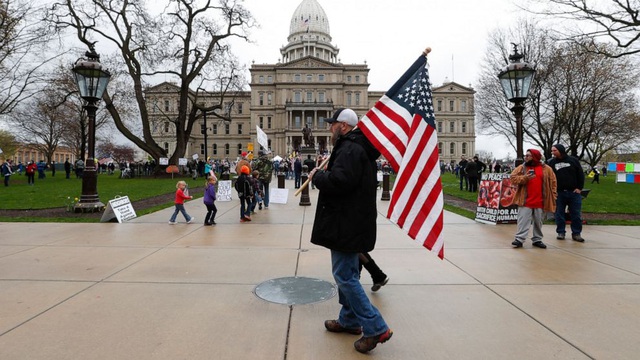 Người biểu tình mang cờ trước tòa nhà nghị viện tại Michigan (Ảnh: AP)