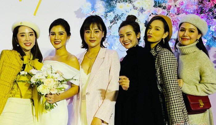 Phương Oanh gợi cảm với thềm ngực nửa kín nửa hở khi chụp hình kỷ niệm cùng cô dâu và bạn bè.