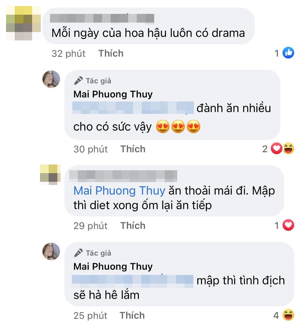 Sau những câu chuyện không mấy vui vẻ mà Mai Phương Thúy gặp phải trong thời gian gần đây, một người bạn của cô đã để lại bình luận: “Mỗi ngày của Hoa hậu luôn có drama”. Đáng chú ý, nàng Hậu đã có phản ứng rất tích cực, vui vẻ: “Đành ăn nhiều cho có sức vậy”.