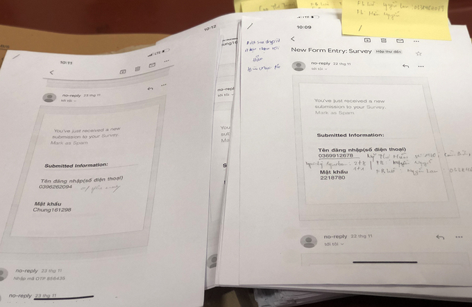 Dữ liệu tài khoản hack được chuyển về email của nhóm nghi phạm. Ảnh: Phạm Dự.