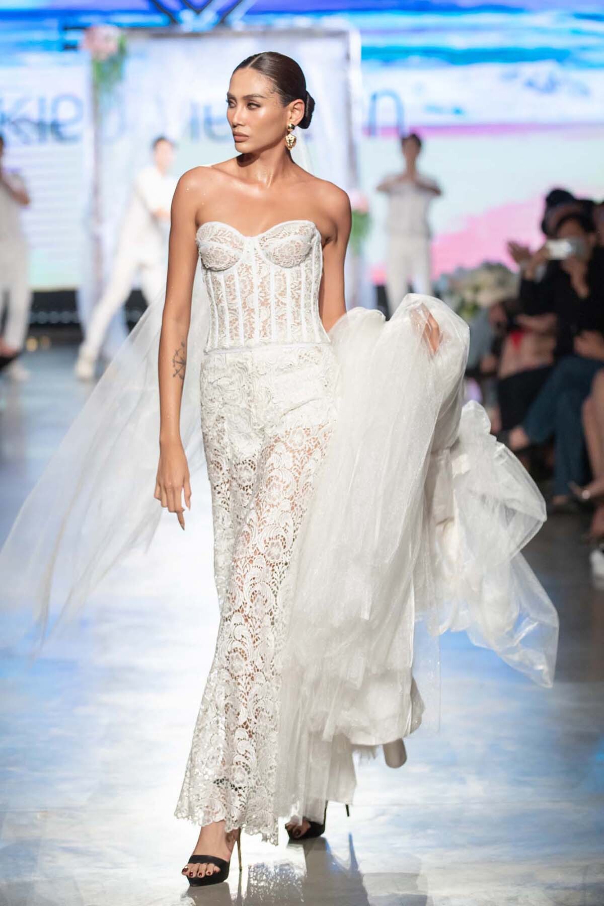 Cô tiếp tục diễn bộ sưu tập mới của Kiều Việt Liên, với trang phục cưới cách điệu từ jumpsuit.