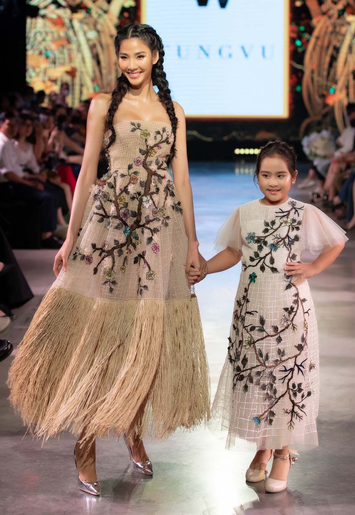 Hoàng Thùy (trái) diện thiết kế theo chủ đề khu vườn thần tiên, với điểm nhấn là các đóa hoa dây thêu nổi và phần chân váy gắn tua rua.