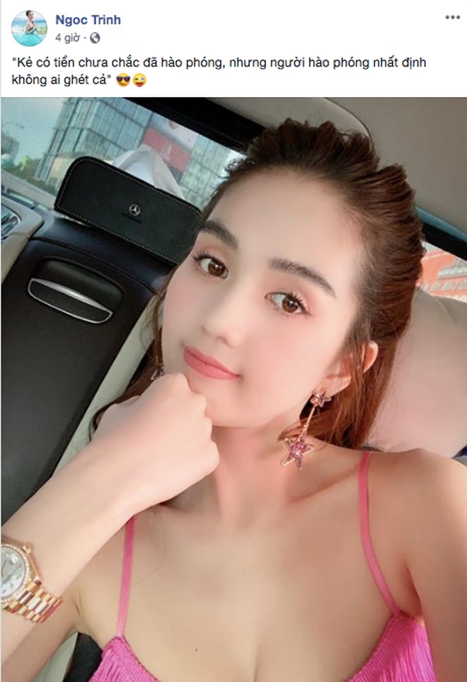 Ngọc Trinh gây chú ý khi đăng tải bức ảnh gợi cảm trên xe hơi. Kèm theo đó, diễn viên Vu quy đại náo có phát ngôn về tiền. Cô viết: "Kẻ có tiền chưa chắc đã hào phóng, nhưng người hào phóng nhất định không ai ghét cả". Dòng trạng thái của Ngọc Trinh lập tức nhận được sự quan tâm của người hâm mộ. Bài viết nhận hơn 25.000 lượt thích và hàng trăm bình luận sau vài giờ đăng tải. Trong đó, phát ngôn liên quan đến tiền của nữ hoàng nội y trở thành đề tài bàn luận của cộng đồng mạng.