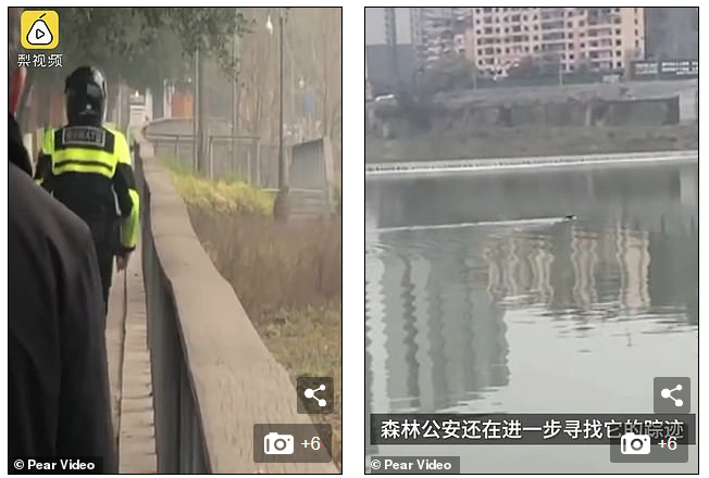 Cảnh sát xuất hiện và truy đuổi, nhưng con lợn rừng đã lao mình xuống sông để chạy trốn.