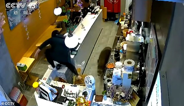 Nữ nhân viên hoảng sợ tìm cách chạy trốn khi con vật lao vào quầy.