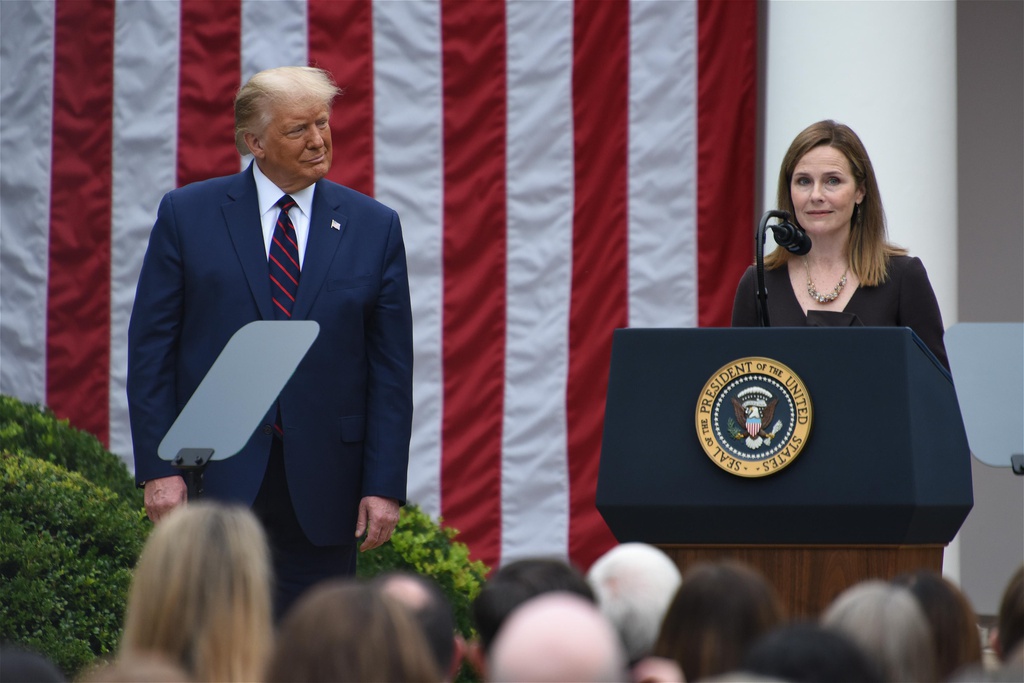 Tổng thống Trump dự lễ bổ nhiệm bà Amy Coney Barrett vào vị trí thẩm phán Tòa án Tối cao. Ảnh: AP.