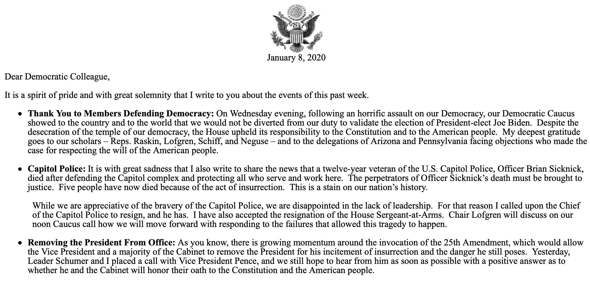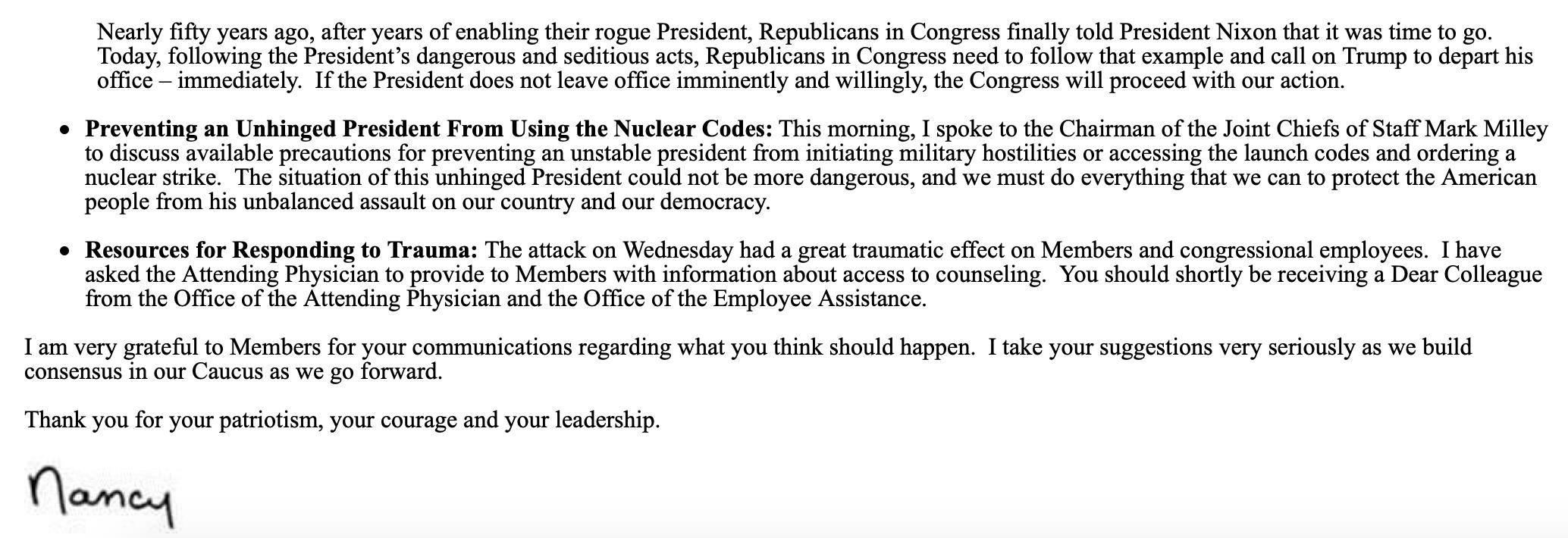 Nguyên văn con mụ viết : "Sáng nay, tôi đã nói chuyện với Chủ tịch Hội đồng Tham mưu trưởng liên quân Mark Milley để thảo luận về các biện pháp phòng ngừa sẵn có nhằm ngăn chặn một tổng thống bất ổn gây ra các hành động thù địch quân sự hoặc truy cập các mã phóng và ra lệnh tấn công hạt nhân. Tình hình của vị Tổng thống không lành lặn này không thể nguy hiểm hơn, và chúng ta phải làm mọi thứ có thể để bảo vệ người dân Mỹ khỏi sự công kích không cân sức của ông ấy đối với đất nước và nền dân chủ của chúng ta."