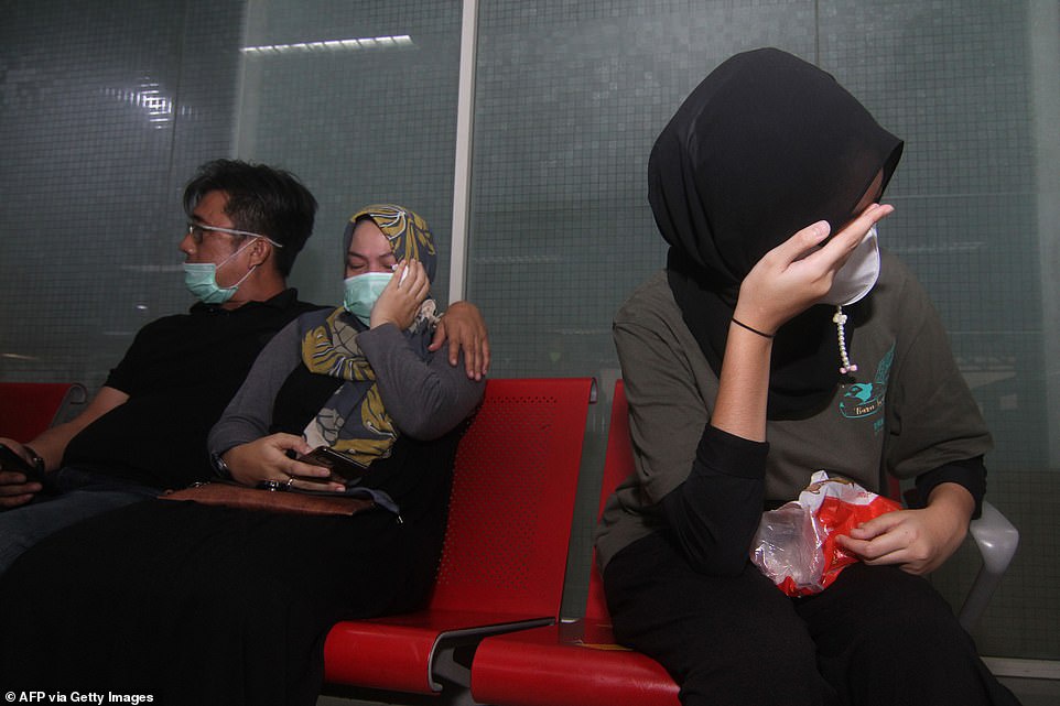 Trong khi đội tìm kiếm cứu hộ đang làm việc, người nhà của hành khách trên chuyến bay gặp nạn đã có mặt tại sân bay Supadio ở thành phố Pontianak. Ban quản lý sân bay này chuẩn bị sẵn một trung tâm xử lý khủng hoảng dành cho gia đình nạn nhân. Ảnh: Antara/AFP.