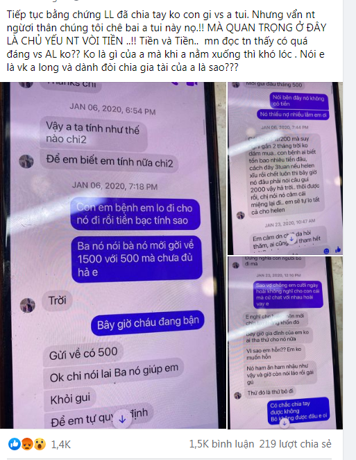 “Tiếp tục bằng chứng LL (Linh Lan) đã chia tay ko con gi với a tui. Nhưng vẫn nt người thân chúng tôi chê bai a tui này nọ.!! MÀ QUAN TRỌNG Ở ĐÂY LÀ CHỦ YẾU NT VÒI TIỀN ..!! Tiền và Tiền… Mọi người đọc tn thấy có quá đáng với anh Long không?? Không là gì của anh mà khi a nằm xuống thì khóc lóc. Nói e là vợ anh Long và dành đòi chia gia tài của a là sao ? – Bạn thân Vân Quang Long viết