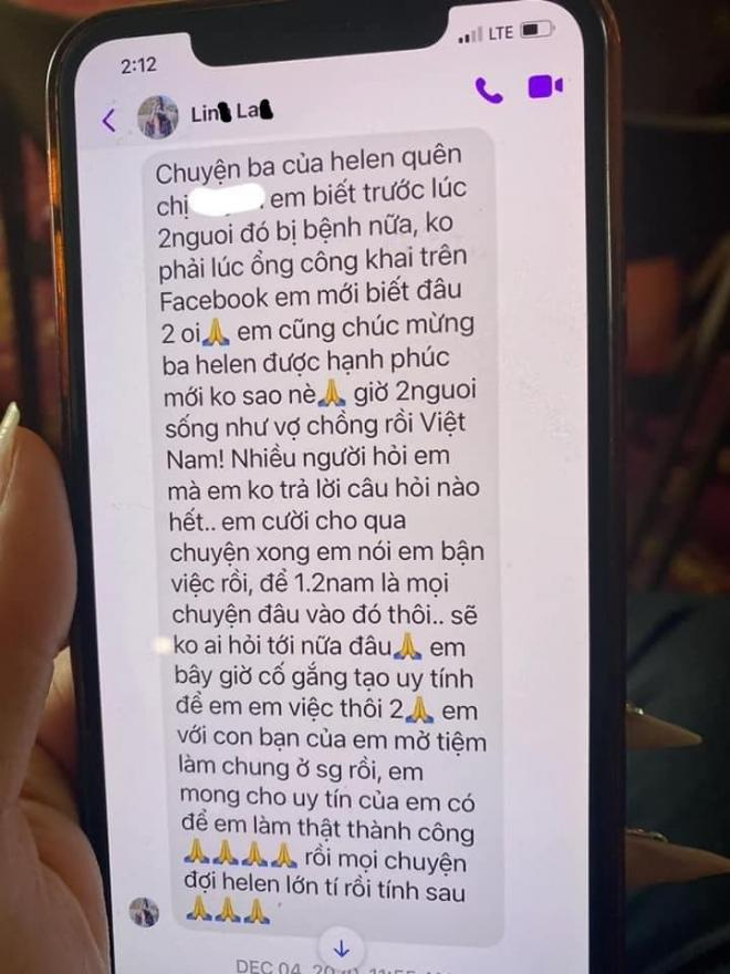 Tin nhắn ngày 07/05/2019, nói rõ đã chia tay Vân Quang Long và không muốn liên quan gì tới cố ca sĩ nữa.