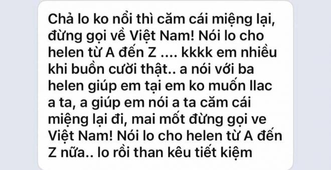 Sau loạt bằng chứng tố Linh Lan hỗn láo, không tôn trọng gia đình chồng, là con giáp thứ 13… Mới đây, một bạn thân của Vân Quang Long tại Mỹ đã công khai nhiều tin nhắn cho thấy Linh Lan liên tục vòi tiền chồng dù mỗi tháng gửi đến 2000 đô. Trên thực tế, cựu thành viên nhóm nhạc 1088 phải làm nhiều nghề vất vả như cắt cỏ, xây nhà… để có tiền gửi về Việt Nam.