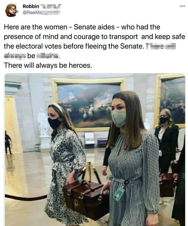 Nhiều bài đăng trên Twitter chia sẻ hình ảnh này nói rằng, các nữ phụ tá vận chuyển các thùng phiếu chứa phiếu bầu đại cử tri của cuộc bầu cử tổng thống Mỹ 2020 khi đám đông hỗn loạn tràn vào Điện Capitol ngày 6.1.